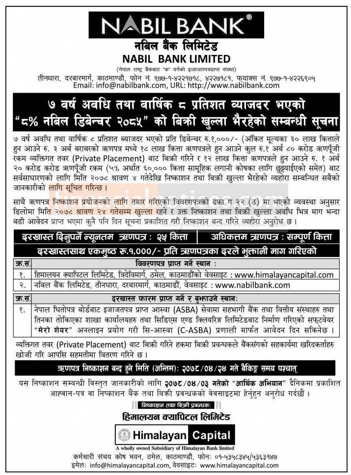 सात वर्ष अवधि भएको नबिल ८% डिबेन्चर २०८५ को विक्री खुल्ला भैरहेको सम्बन्धी सूचना