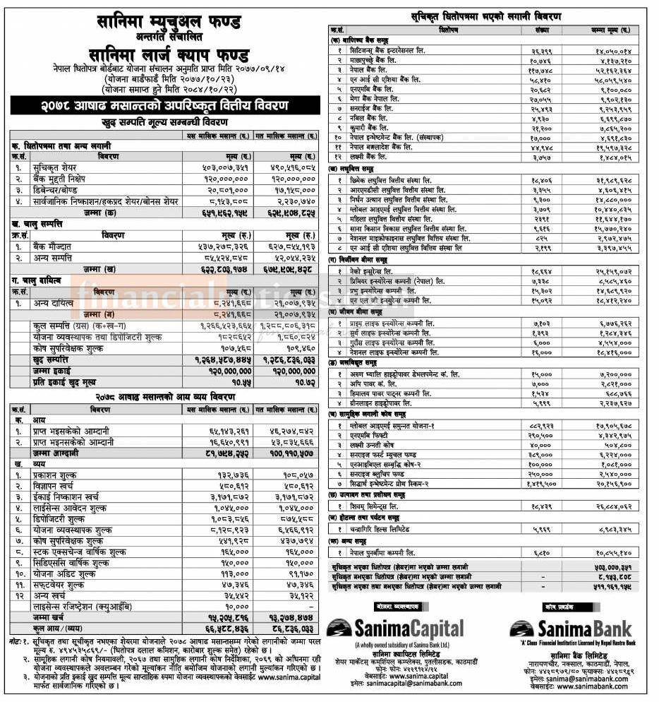 Sanima Capital has published the “Sanima Large Camp Fund” NAV upto Ashad, 2078