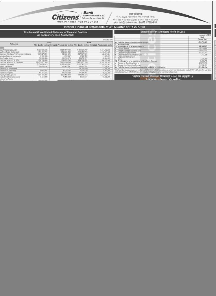 सिटिजन्स बैंकको खुद नाफा रू. १ अर्ब ५९ करोड ८७ लाख