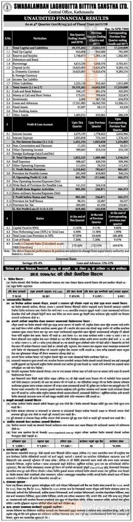 स्वाबलम्बन लघुवित्तको खुद नाफा ६१ करोड ९४ लाख रुपैयाँ - Q4 Report -