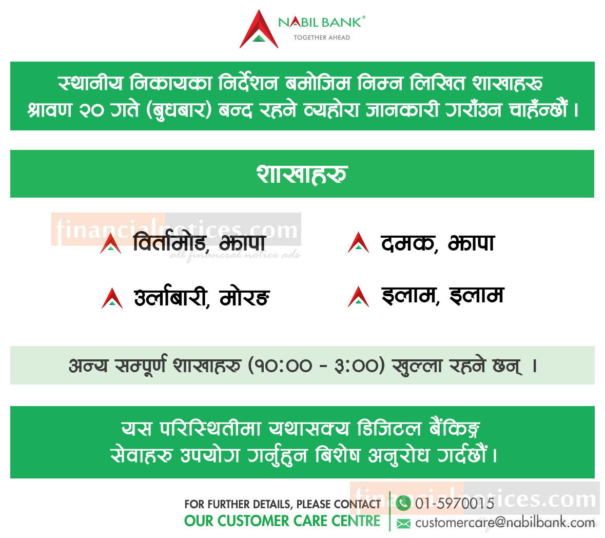 नबील बैंकको शाखा कार्यालयहरु बन्द रहने बारे सूचना ।