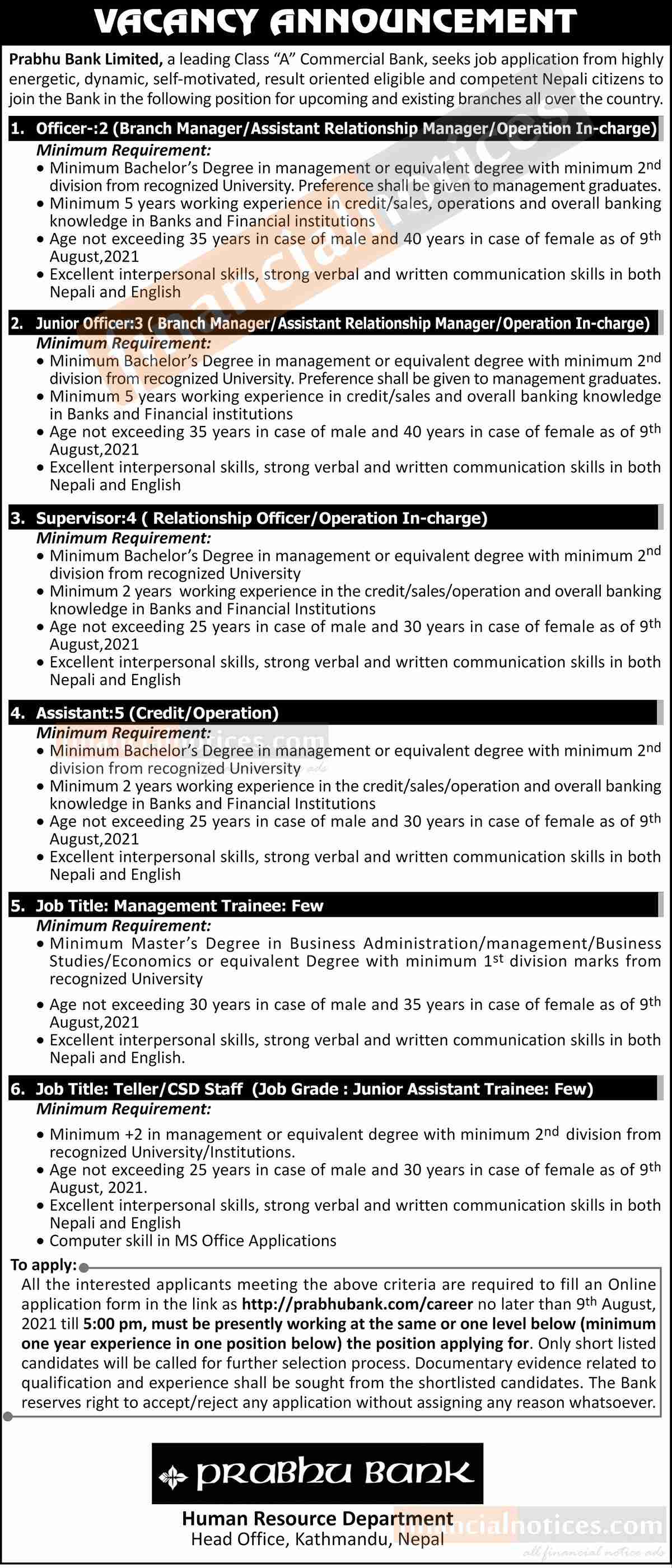प्रभु बैंकमा कर्मचारी आवश्यकता - Banking Career -