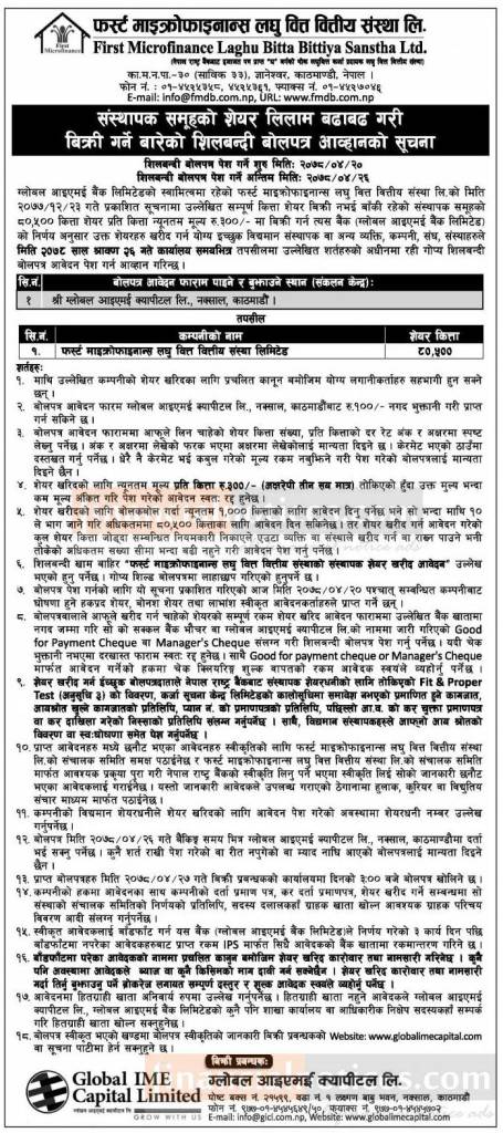 फर्स्ट माइक्रोफाइनान्सको संस्थापक समूहको ८०,५०० कित्ता शेयर लिलामी विक्रि बारे सूचना