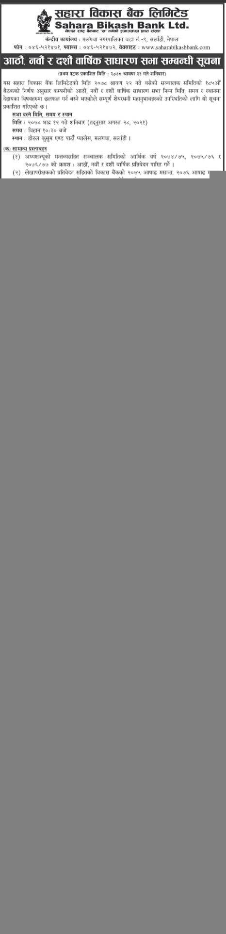 साहारा विकास बैंकको आठौं, नवौं र दशौं वार्षिक साधारण सभा सम्बन्धी सूचना