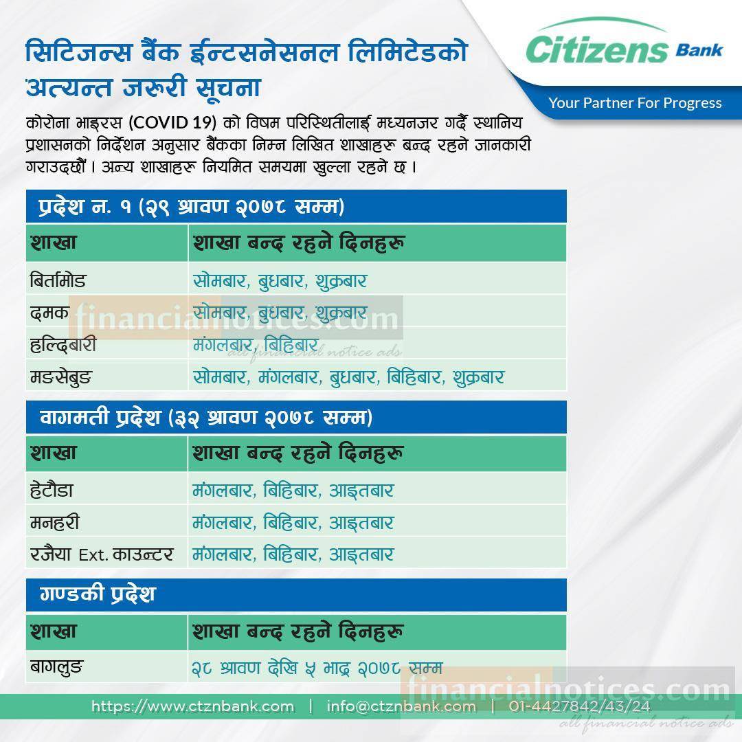 सिटिजन्स बैंकका शाखा कार्यालयहरु बन्द रहने सम्बन्धी सूचना ।