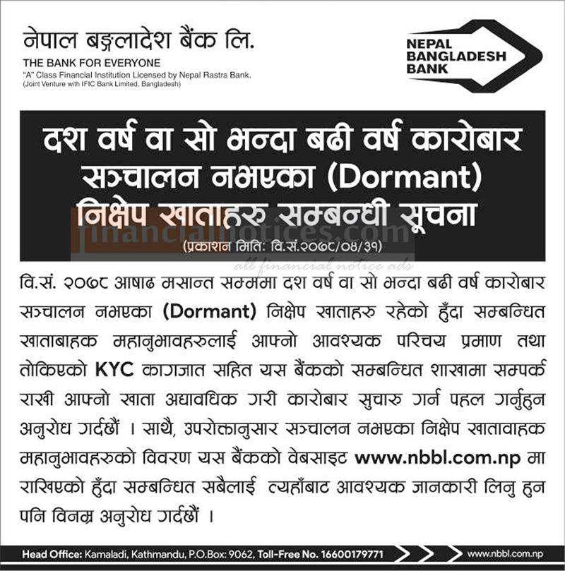 दश बर्ष वा सो भन्दा भढी बर्ष कारोबार संचालन नभएका निक्षेप खाताहरु सम्बन्धी सूचना