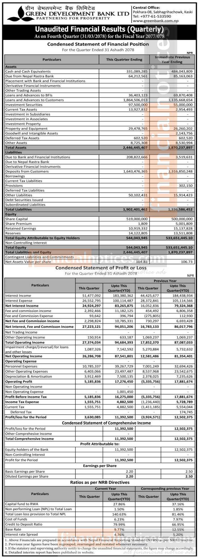 Green Development Bank has posted a net profit of Rs 11.39 million during the 4th quarter