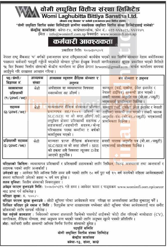 लघुवित्तमा कर्मचारी आवश्यकता - Job Vacancy -