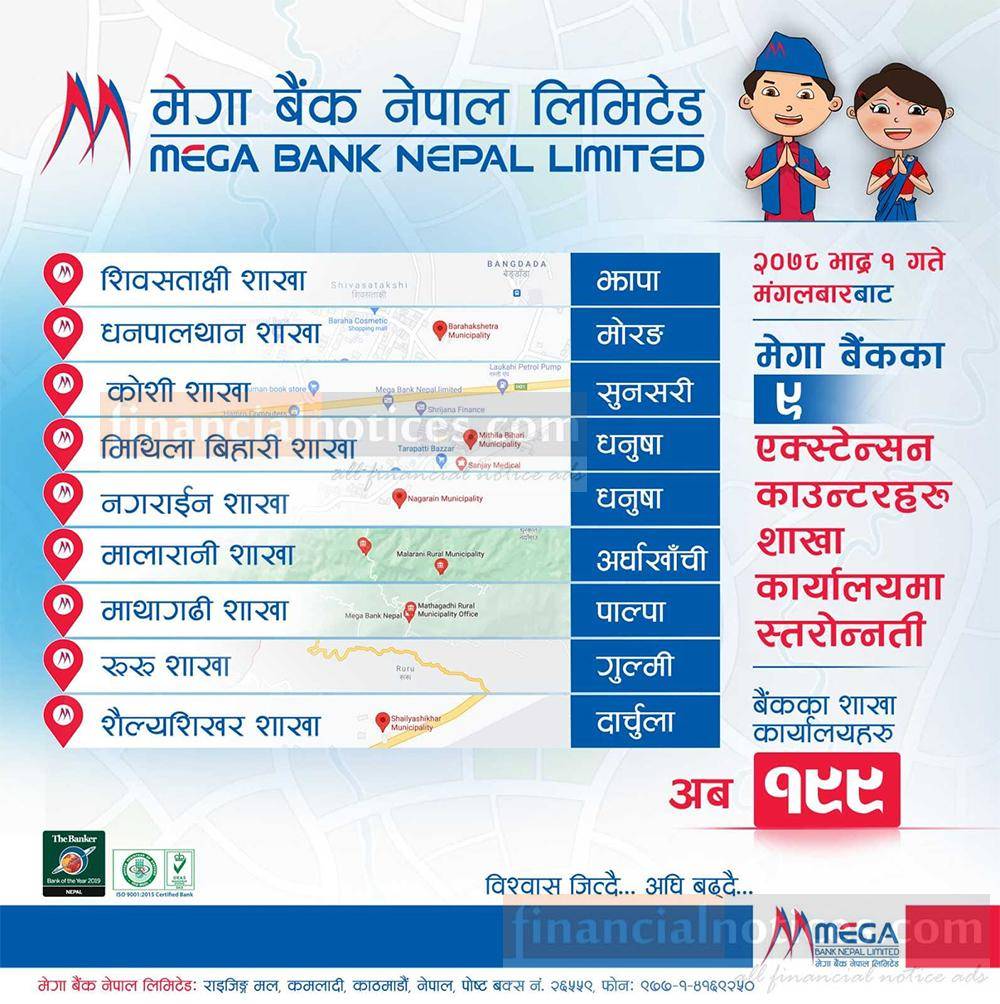 मेगा बैंकको ९ एक्सटेंसन काउंटरहरू शाखा कार्यालयमा परिणत बारे सूचना !