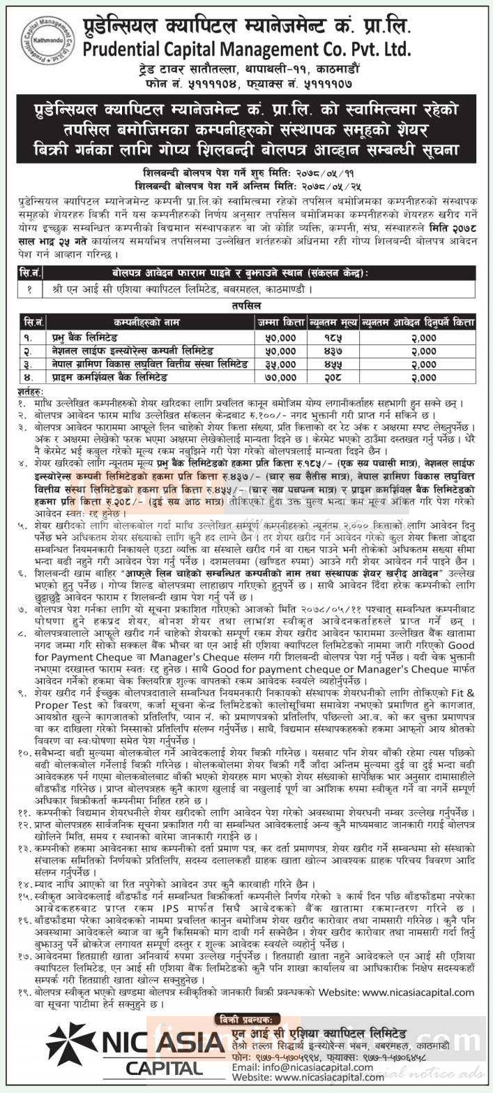 संस्थापक समूहको शेयर बिक्रीको लागि गोप्य शिलबन्दी बोलपत्र आव्हानको सूचना