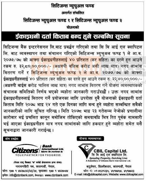 सिटिजन्स म्युचुअल फण्ड १ र २ योजनाको ईकाइधनी दर्ता किताब बन्द हुने सूचना