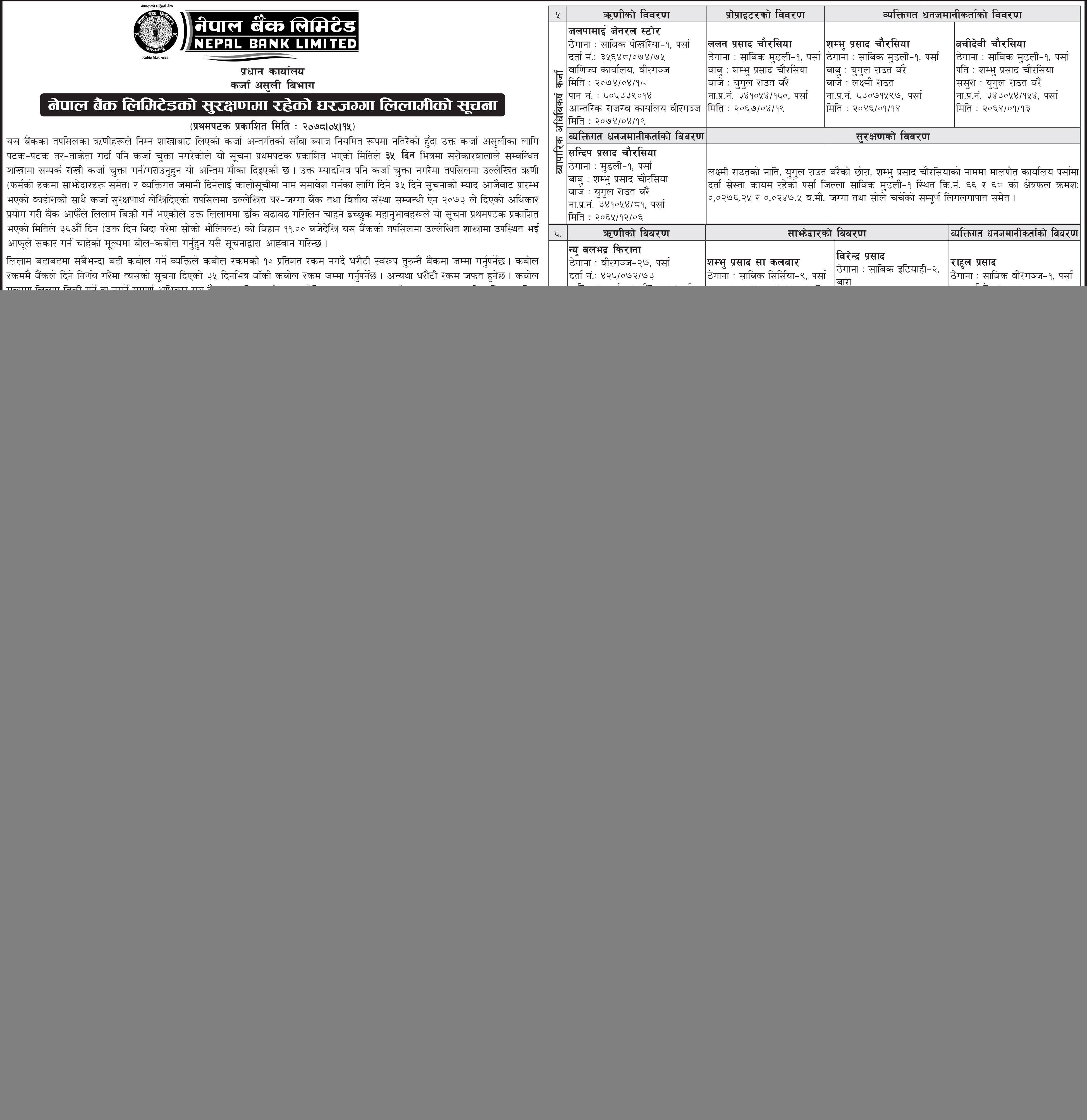 नेपाल बैंकको सुरक्षणमा रहेको घरजग्गा लिलामीको सूचना