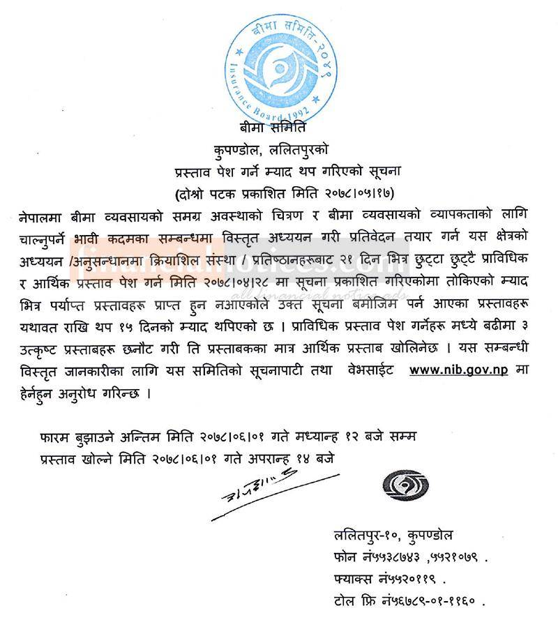 बीमा क्षेत्रको अध्ययन गर्न कसैले आवेदन नदिएकोले पुन म्याद थप गरिएको बारे सूचना
