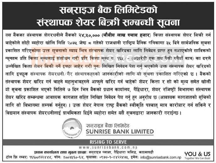 Published by Sunrise Bank Limited Rajdhani Newspaper on 2075-3-29