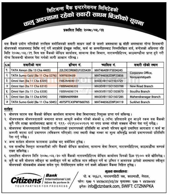 बैंकको चालु अवस्थामा रहेको सवारी साधन बिक्रीको सूचना