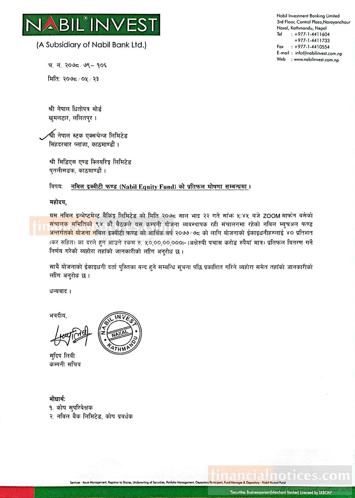 Nabil Equity Fund को ४० % प्रतिफल घोषणा सम्बन्धी सूचना