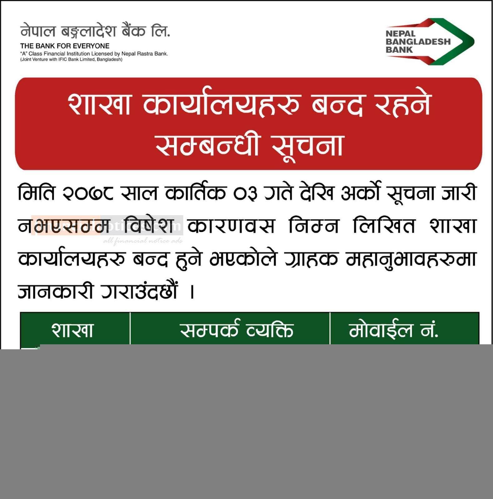 बैंकको शाखा कार्यालय बन्द रहेन सम्बन्धी सूचना