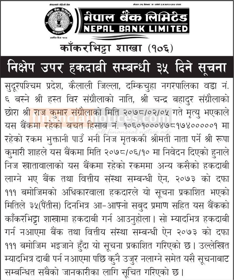 निक्षेप उपर हकदावी सम्बन्धी ३५ दिने सूचना