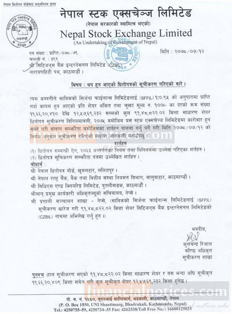 सिटिजन्स बैंकको ९१ लाख ४८ हजार ८२२.०२ कित्ता सेयर सूचिकृत सम्बन्धी सूचना