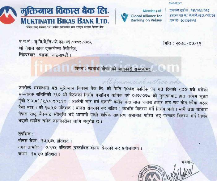 मुक्तिनाथ विकास बैंकको लाभांश घोषणा सम्बन्धी सूचना
