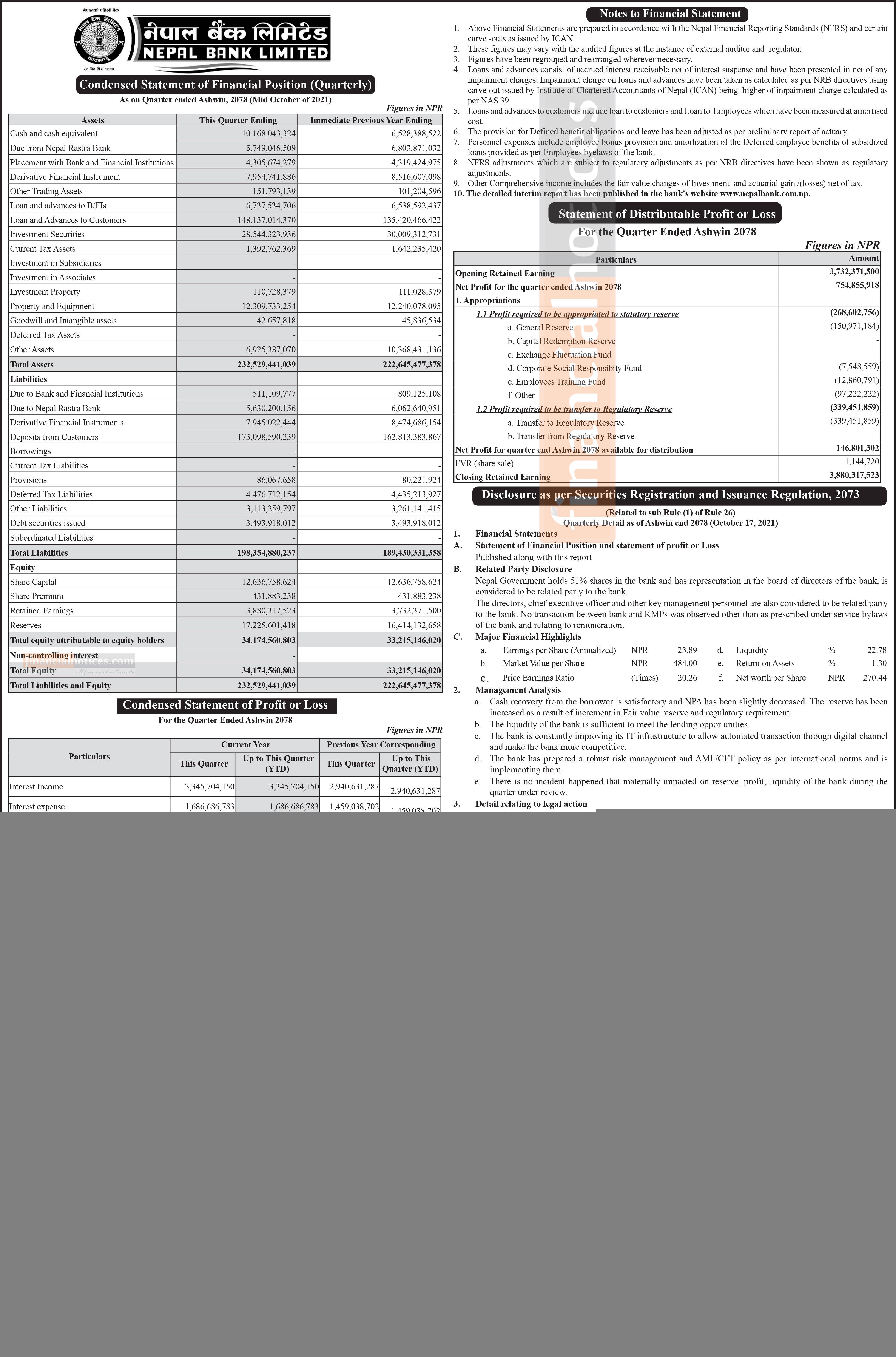 नेपाल बैंकको खुद नाफा ७५ करोड ४८ लाख रुपैयाँ - Q1 Report -