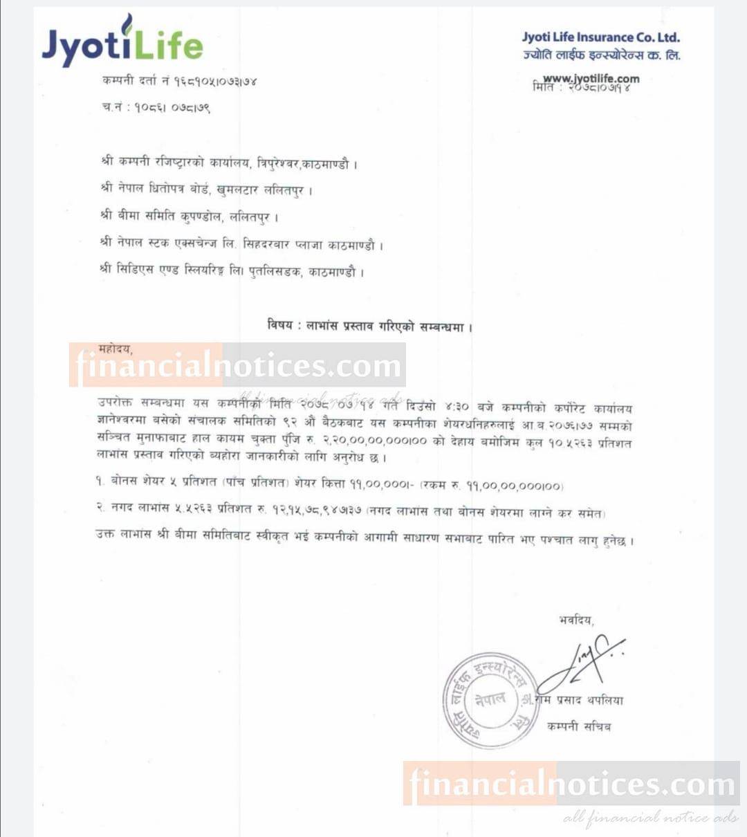 ज्योती लाईफ इन्स्योरेन्सको लाभांश घोषणा बारे सूचना