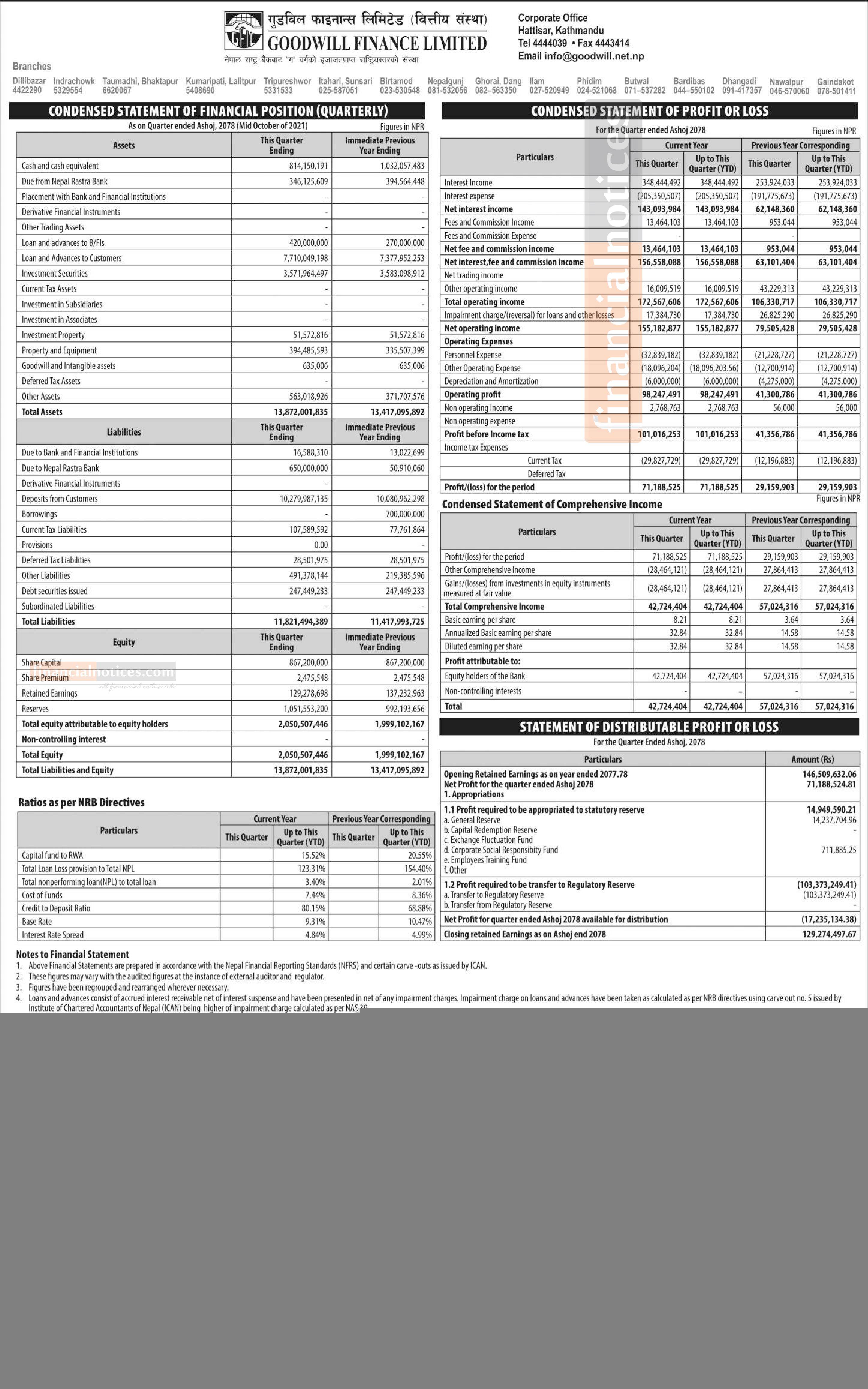 Goodwill Finance has posted a net profit of Rs 71.18 million during 1st Quarter.