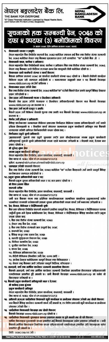 नेपाल बंगलादेश बैंकको सूचनाको हक सम्बन्धी ऐन, २०६४ को दफा ५ उपदफा ३ बमोजिमको विवराण