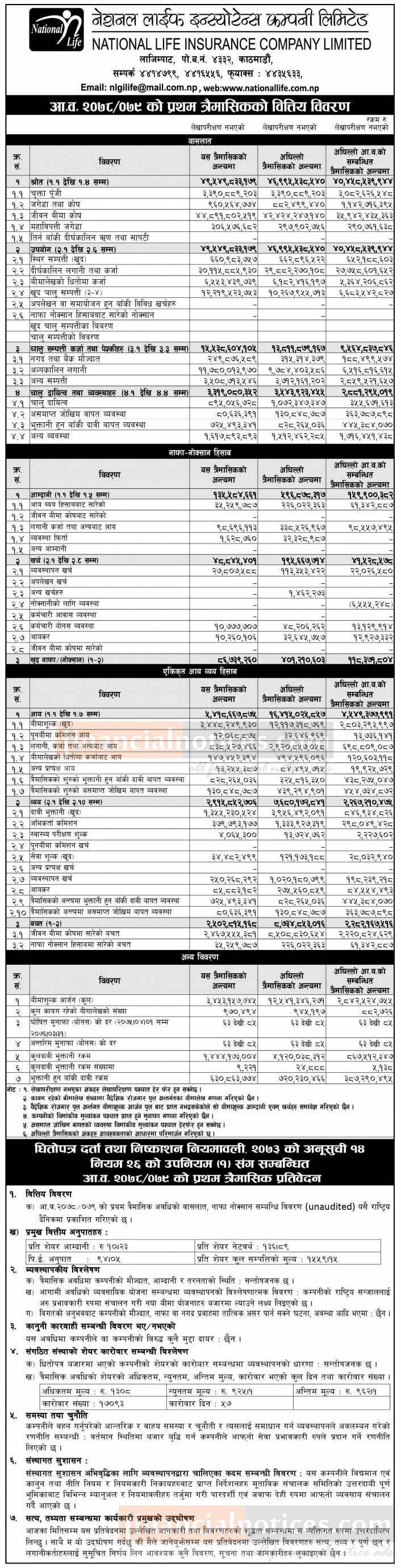 नेशनल लाईफ इन्योरेन्सको खुद नाफा ८ करोड ६७ लाख रुपैयाँ - Q1 Report -