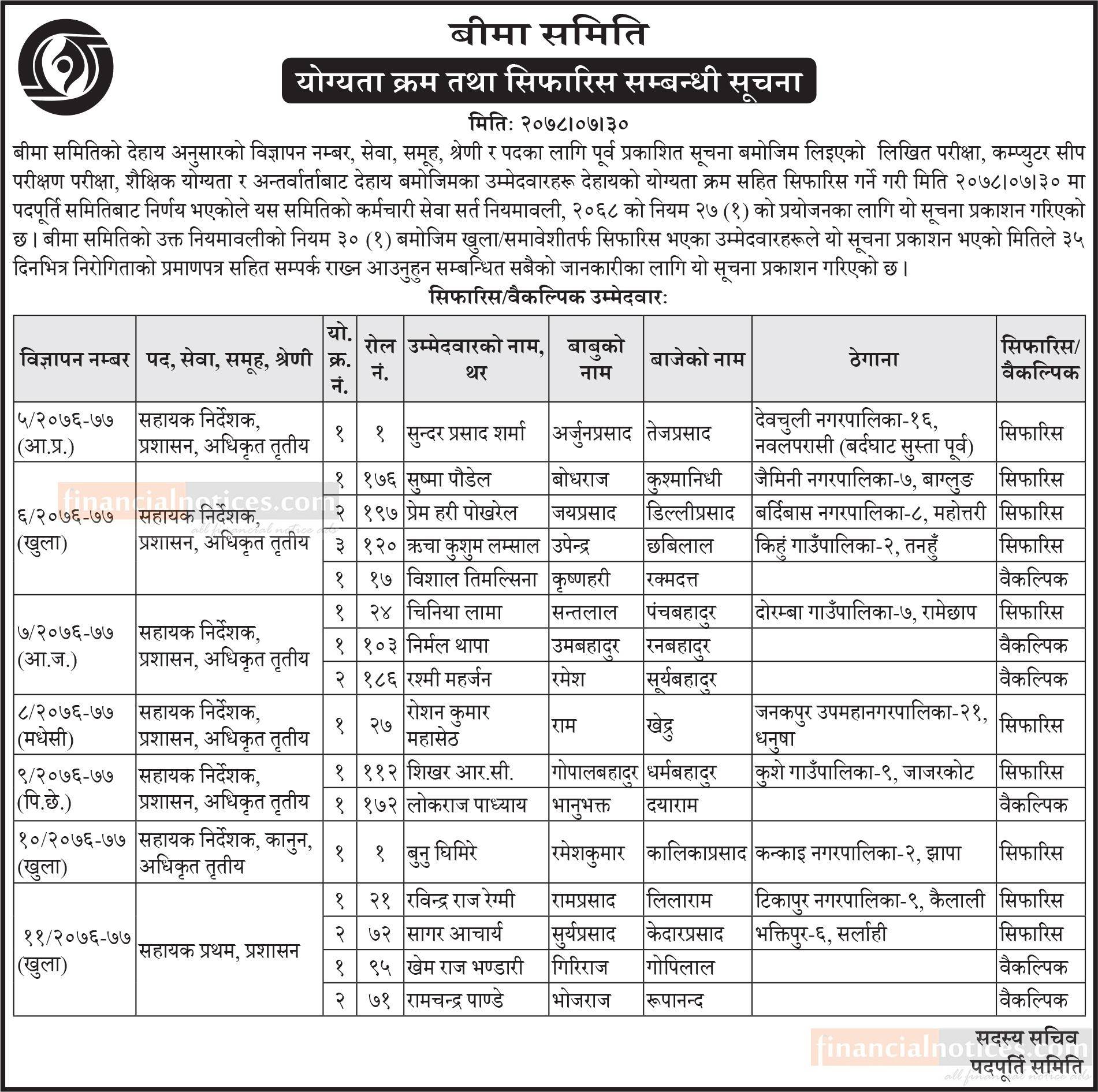 बीमा समितिको योग्यताक्रम तथा सिफारिस सम्बन्धी सूचना