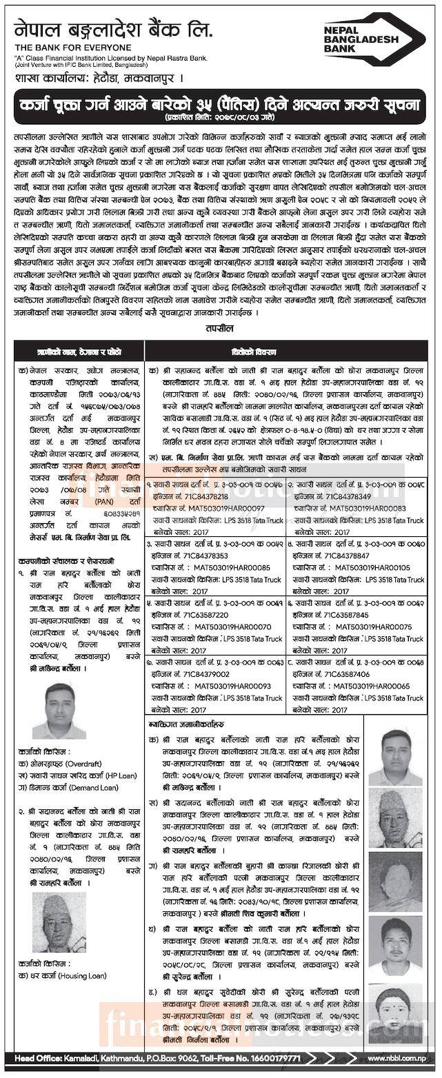 नेपाल बंगलादेश बैंक हेटौडा शाखाका तपशिलका ऋणहरुलाई कर्जा चुक्ता गर्न आउनेबारे सूचना