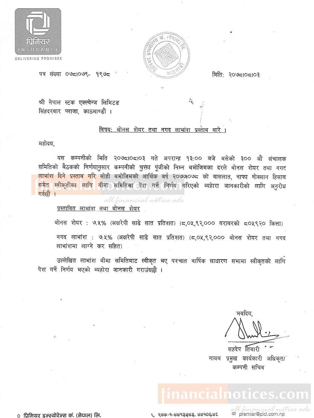 प्रिमियर इन्स्योरेन्सको १५ प्रतिशत लाभांश घाेषणा