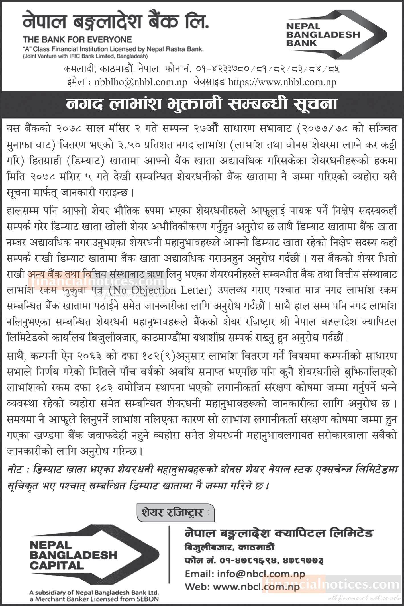नेपाल बंगलादेश बैंकको नगद लाभांश भुक्तानी सम्बन्धी सूचना