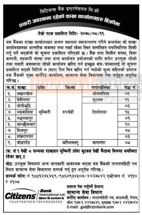 बैंकको तयारी अवस्थामा रहेको शाखा कर्यालयहरु बिक्रीमा