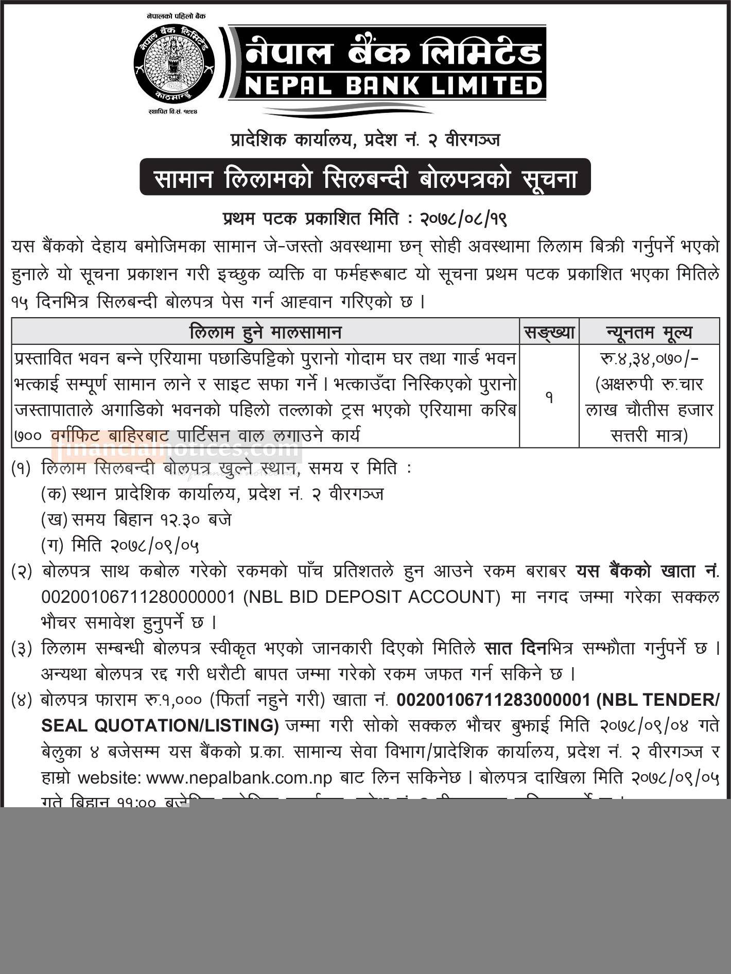 नेपाल बैंकको प्रादेशिक कार्यालयको सामान लिलाम सिलबन्दी बोलपत्रबारे सूचना