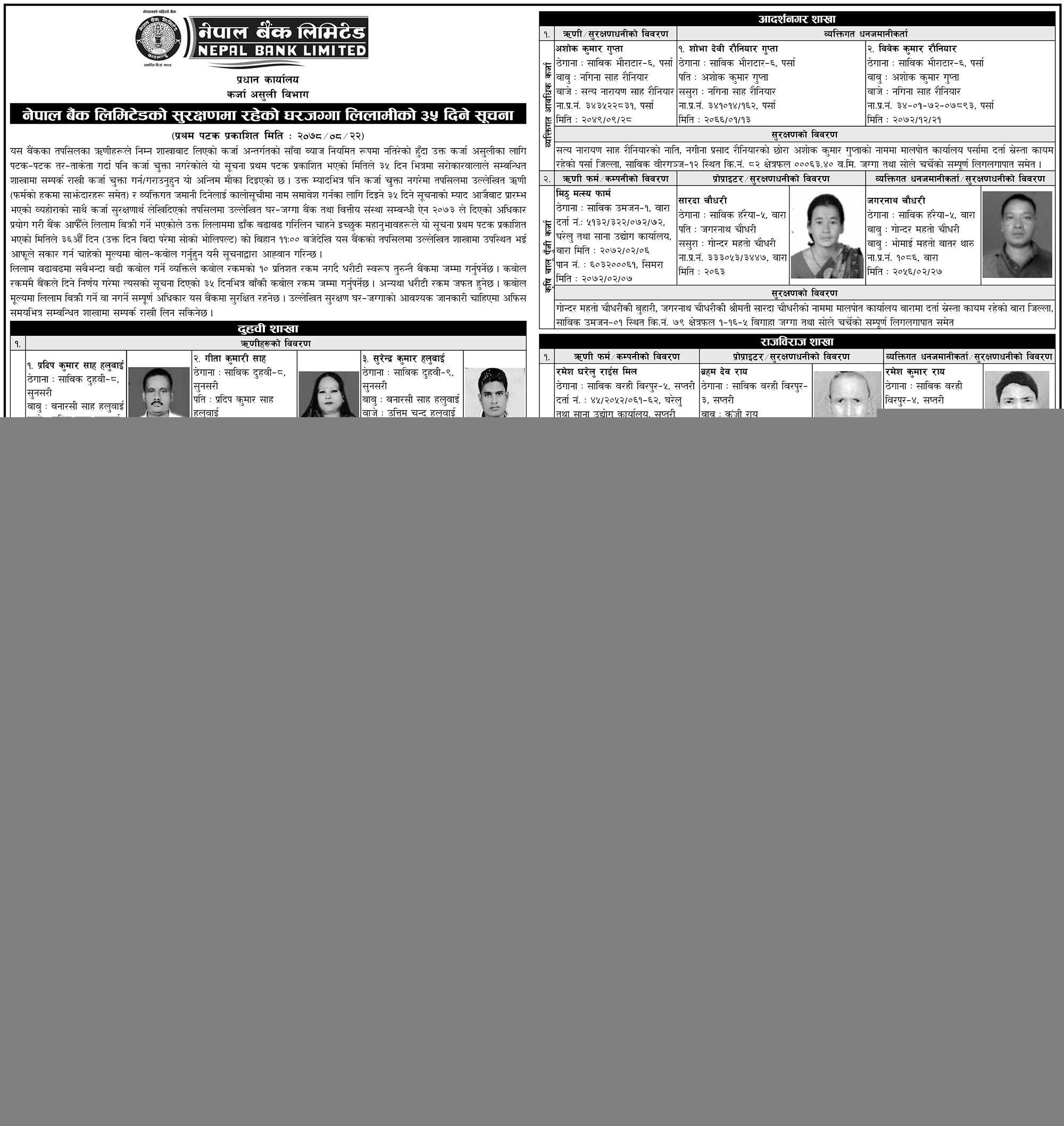 नेपाल बैंकको सूरक्षणमा रहेको घरजग्गा लिलामीको ३५ दिने सूचना