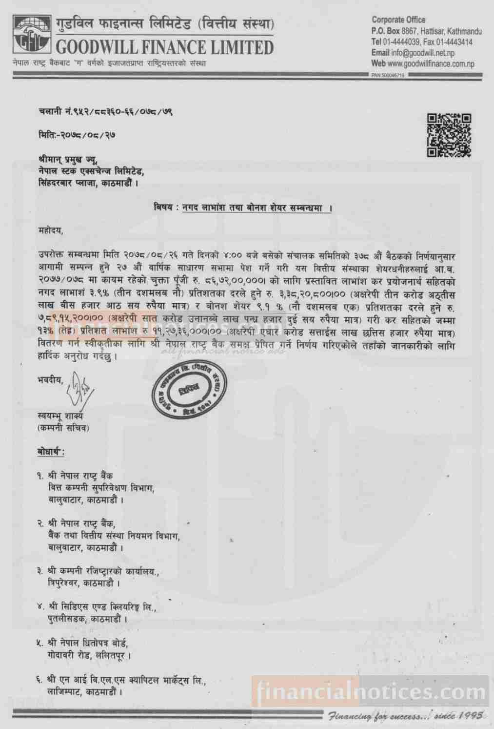 गुडविल फाइनान्सको लाभांश घोषणा सम्बन्धी सूचना
