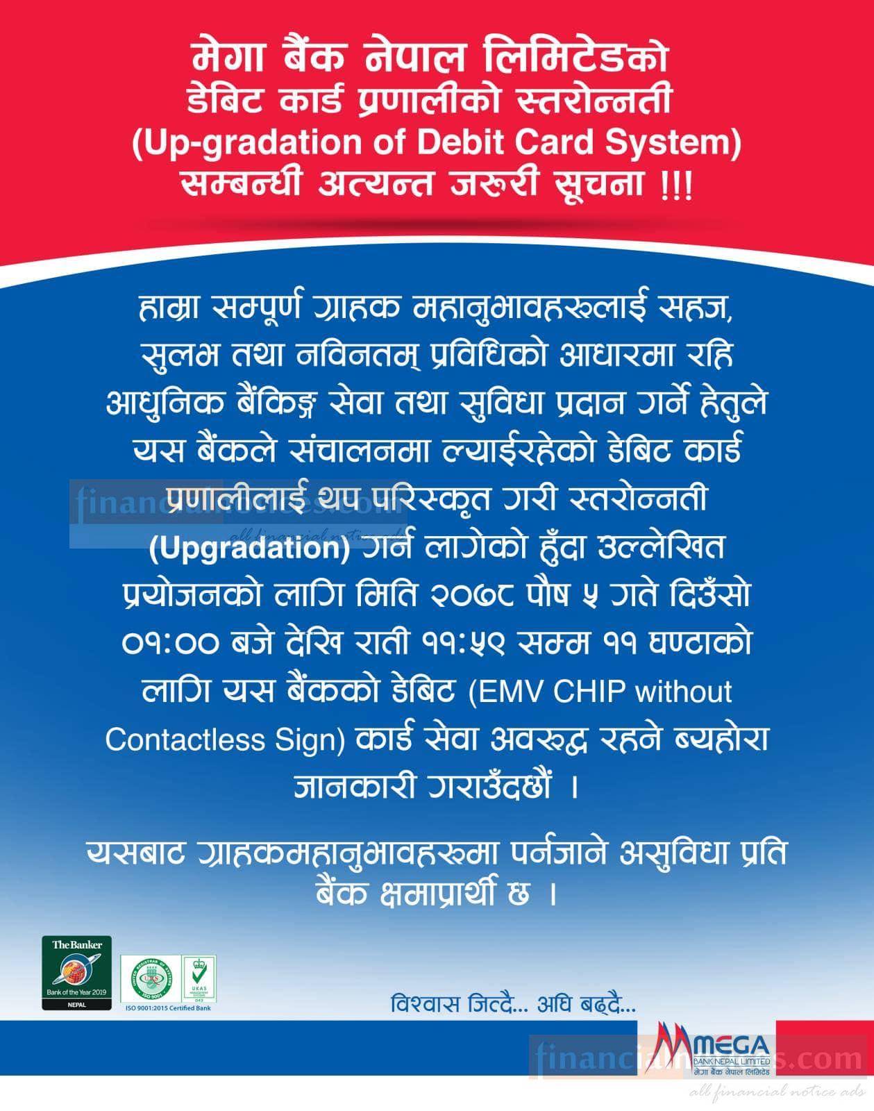 मेगा बैंक नेपालको डेबिट कार्ड प्रणाली स्तरनोन्नती सम्बन्धी अत्यन्त जरुरी सूचना