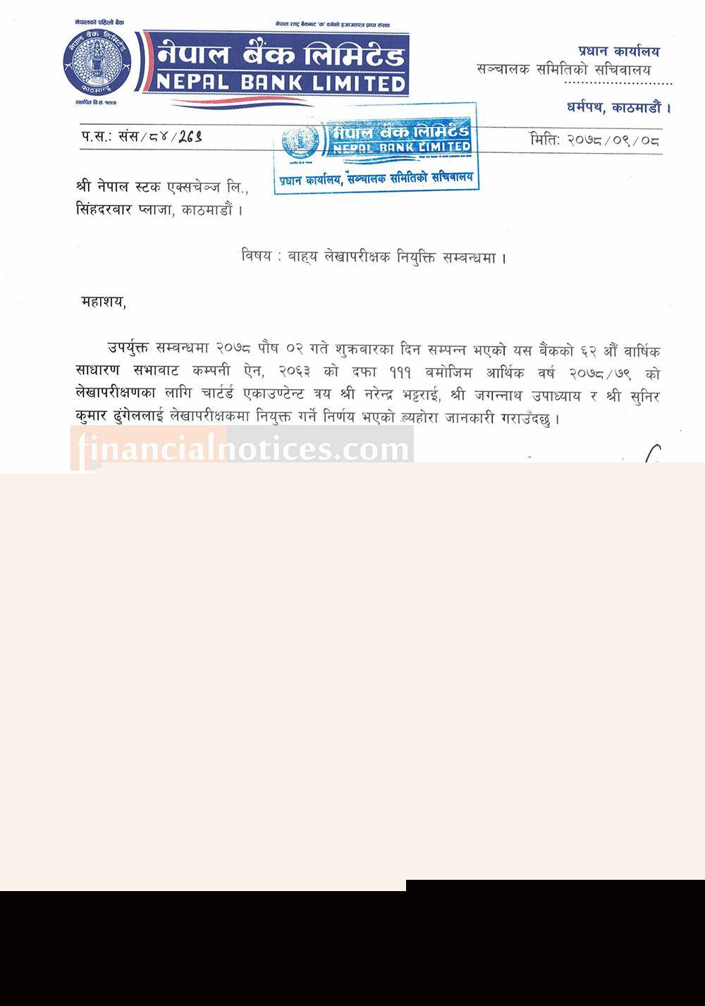 नेपाल बैंकको वाह्य लेखापरीक्षक नियुक्ति सम्बन्धी सूचना