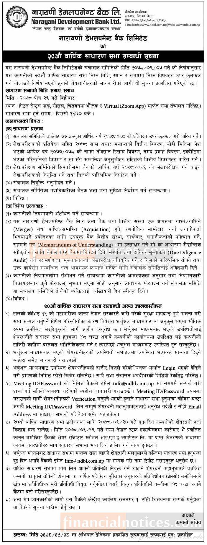 नारायणी डेभलपमेन्ट बैंकको २० औं वार्षिक साधारण सभा सम्बन्धी सूचना