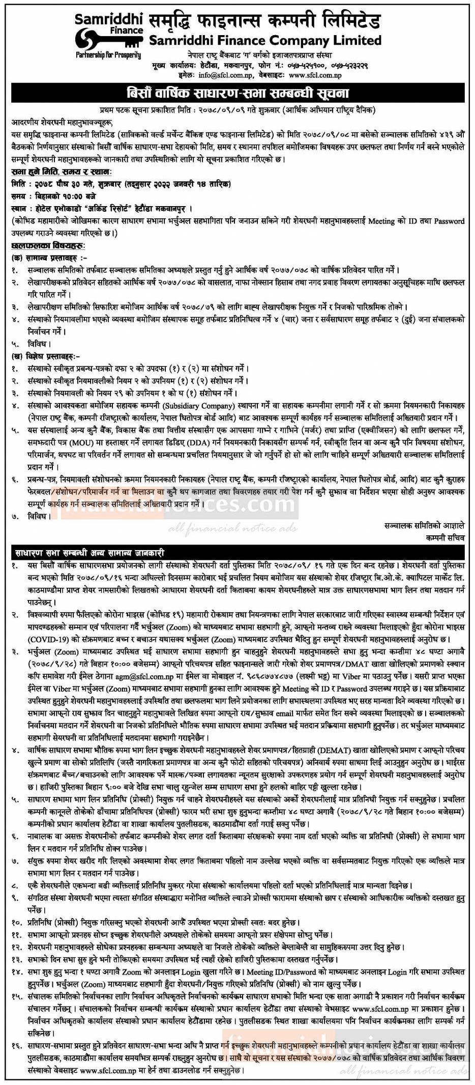 समृद्धि फाइनान्सको बिसौं वार्षिक साधराण सभा सम्बन्धी सूचना