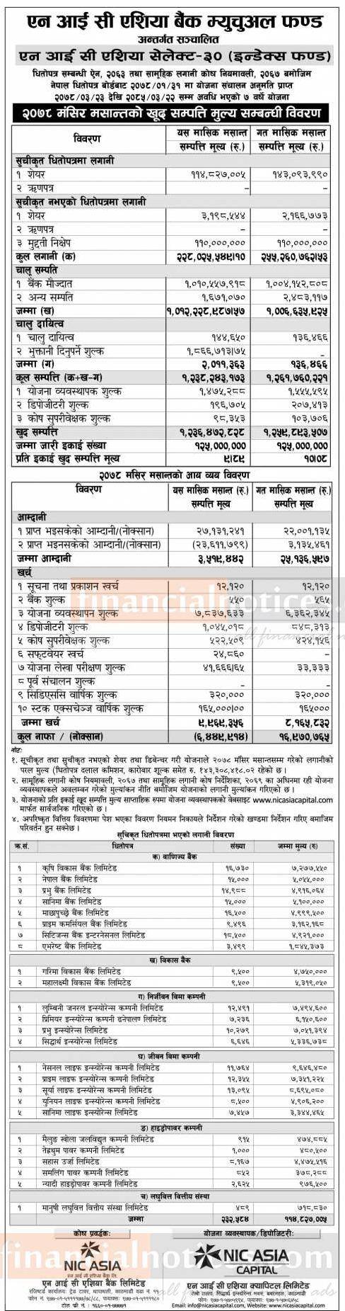 NIC Asia Capital has published 'NIC Asia Select-30 : Index Fund' NAV up to Mangsir, 20