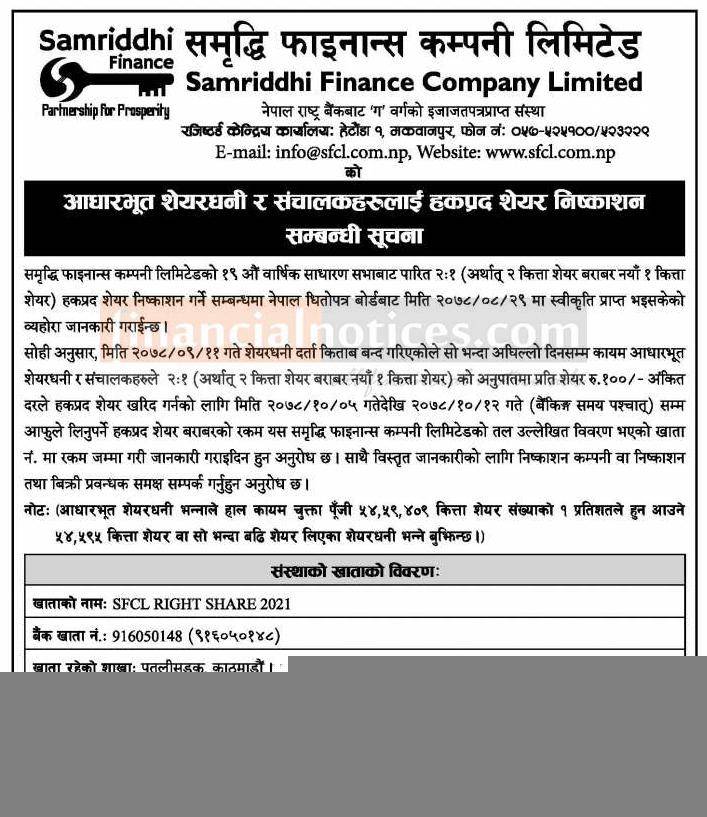 समृद्धि फाइनान्सको आधारभूत शेयरधनी र संचालनकहरुलाई हकप्रद शेयर निष्काशन सम्बन्धी सूचना