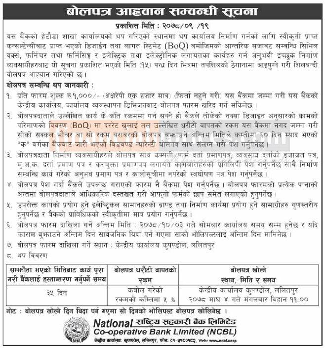 राष्ट्रिय सहकारी बैंकको बोलपत्र आव्हान सम्बन्धी सूचना