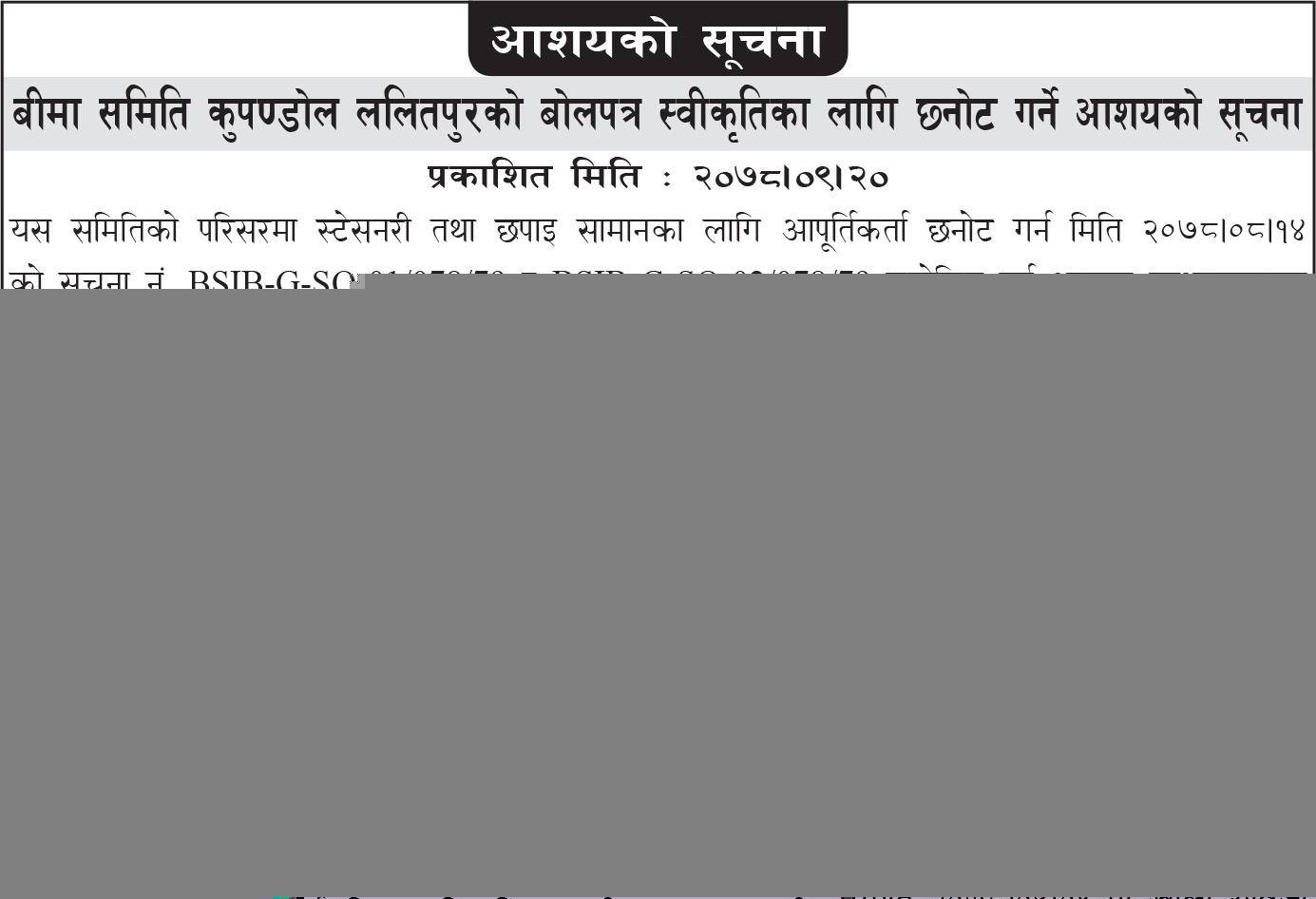 बीमा समिति कुपण्डोलको बोलपत्र स्वीकृतिका लागि छनोट गर्ने आशयको सूचना