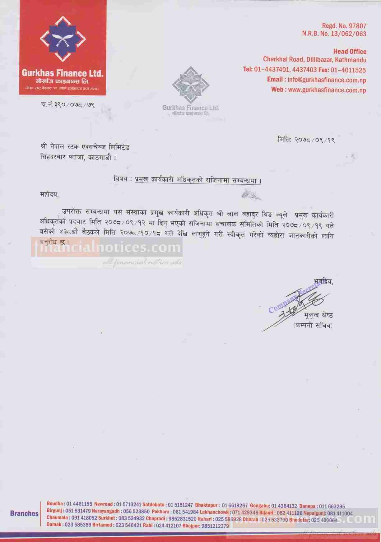 गोर्खाज फाइनान्सका प्रमुख कार्यकारी अधिकृत थिङको राजीनामा सम्बन्धी सूचना