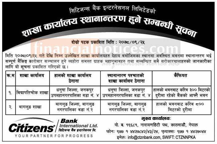बैंकको शाखा कार्यालय स्थानान्तरण हुने बारे सूचना