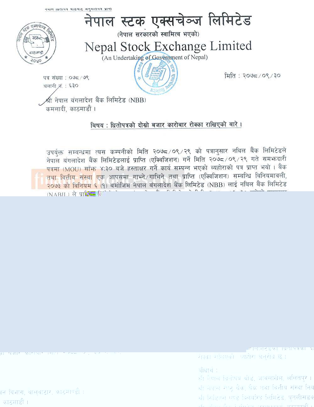 नबिल बैंकले प्राप्ति गर्ने भएसँगै नेपाल बङ्गलादेश बैंकको शेयर कारोबार रोक्का बारे सूचना