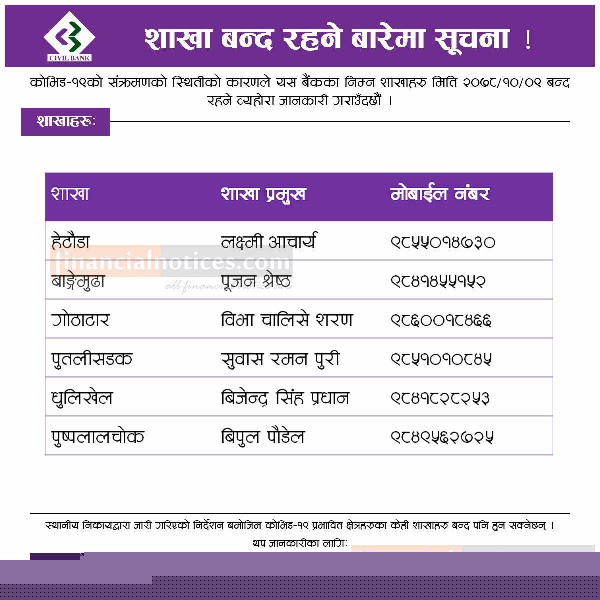सिभिल बैंकको निम्न शाखा बन्द रहने बारेमा सूचना !