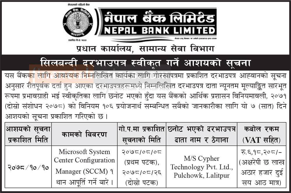 शिलबन्दी दरभाउपत्र स्वीकृत गर्ने आशयको सूचना